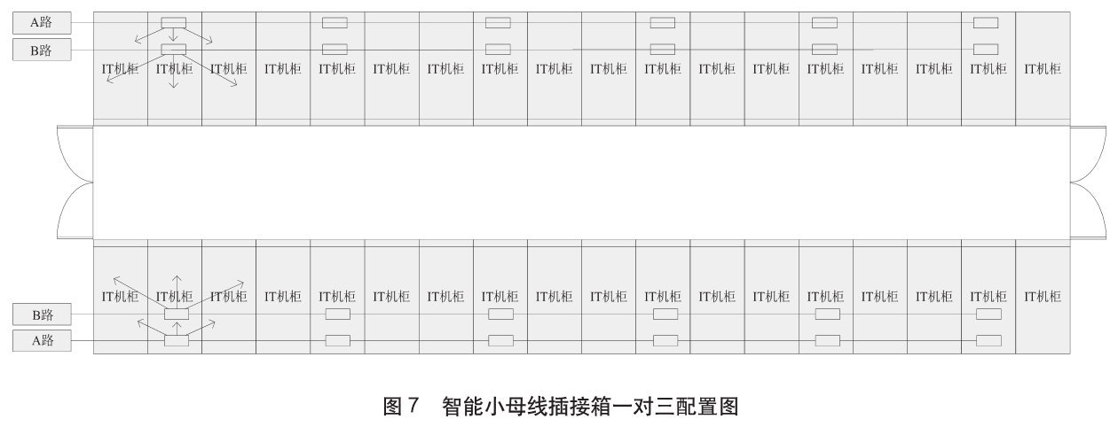 (5)對于分批次部署服務(wù)器的數(shù)據(jù)中心,或后期需要進(jìn)行末端負(fù)荷調(diào)整的數(shù)據(jù)中心,強(qiáng)烈建議采用滑軌式的智能小母線配電方案;如果是一次性部署服務(wù)器或是方案固定的數(shù)據(jù)中心,可采用列頭柜加電纜的配電方案。