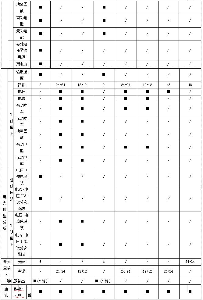 遙測:三相電壓、電流、有功功率、無功功率、視在功率、功率因數(shù)、有功電能、無功電能、電纜溫度,系統(tǒng)頻率、零序電流、零地電壓、漏電流、機(jī)柜溫度、機(jī)柜濕度、開關(guān)狀態(tài)、電壓/電流諧波含量、電流/功率;