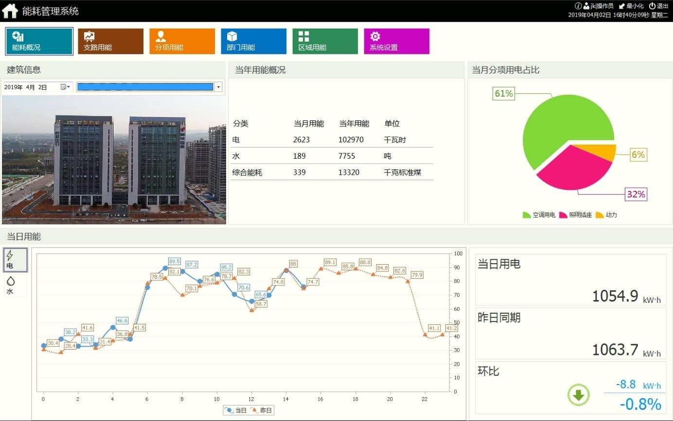 通過表計計量電能消耗,界面下方顯示電能的當日逐時用能曲線;單擊每個分類能耗的上部區域,可跳轉到該分類能耗的用能分析主界面;
