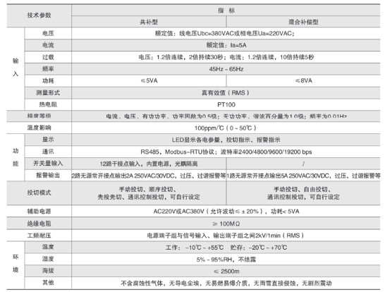 技術要求:輸入三相電壓AC220V;輸入電流AC5A;投切方式順序投切;補償方式三相共補;投切控制路數6路;開關量輸入6路;柜內溫度檢測。