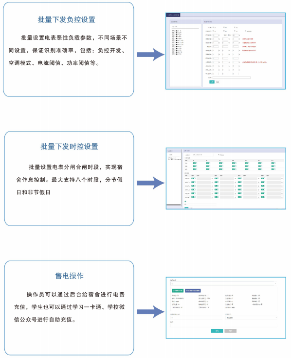 高校宿舍預付費電控系統集電能計量、收費管理、用電過程管理等功能于一體,具備遠程實時抄表計量、控制學生作息、惡性負載識別預警、校園一卡通自助繳費、微信查詢、打印用能報表等功能,創建節約校園、安全校園,方便校方進行一體化、信息化管理,并支持和智慧校園系統的數據對接。
