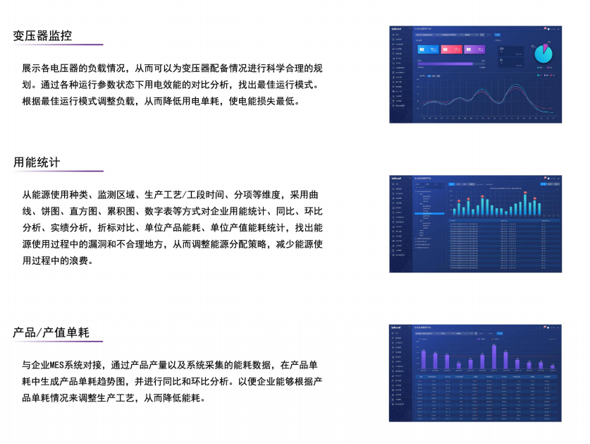 安科瑞企業(yè)能源管控平臺采用自動化、信息化技術(shù)和集中管理模式,對企業(yè)的生產(chǎn)、輸配和消耗環(huán)節(jié)實(shí)行集中扁平化的動態(tài)監(jiān)控和數(shù)據(jù)化管理,監(jiān)測企業(yè)電、水、燃?xì)狻⒄羝皦嚎s空氣等各類能源的消耗情況,通過數(shù)據(jù)分析,、挖掘和趨勢分析,幫助企業(yè)針對各種能源需求及用能情況、能源質(zhì)量、產(chǎn)品能源單耗、各工序能耗、重大能耗設(shè)備的能源利用情況等進(jìn)行能耗統(tǒng)計(jì)、同環(huán)比分析、能源成本分析、用能預(yù)測、碳排分析,為企業(yè)加強(qiáng)能源管理,提高能源利用效率、挖掘節(jié)能潛力、節(jié)能評估提供基礎(chǔ)數(shù)據(jù)和支持。